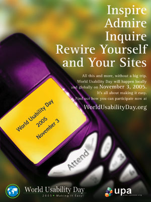 This international event will have a rolling timeline, documented on the worldusabilityday.org website. The day will begin with events in Australasia, and then move westward to end with an event at the DUX 2005 (Designing for User Experiences) Conference in San Francisco.