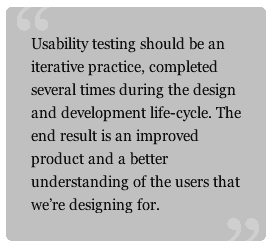 The first article in this series is on one of my favorite practices: usability testing. The most critical aspect of user-centered design, usability testing breaks down the wall between the designer and user, and allows us to see how real users do real tasks in the real world. There are many benefits of usability testing, including uncovering pitfalls in a current system before a redesign and evaluating the usability of a system during and after design. Usability testing should be an iterative practice, completed several times during the design and development life-cycle. The end result is an improved product and a better understanding of the users that we’re designing for.