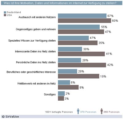 Die Hauptmotivation zur Nutzung von Web 2.0 Angeboten ist der Austausch mit anderen Nutzern. Amerikanische Internetnutzer sind eher bereit persönliche Informationen im Internet zu veröffentlichen als Deutsche.