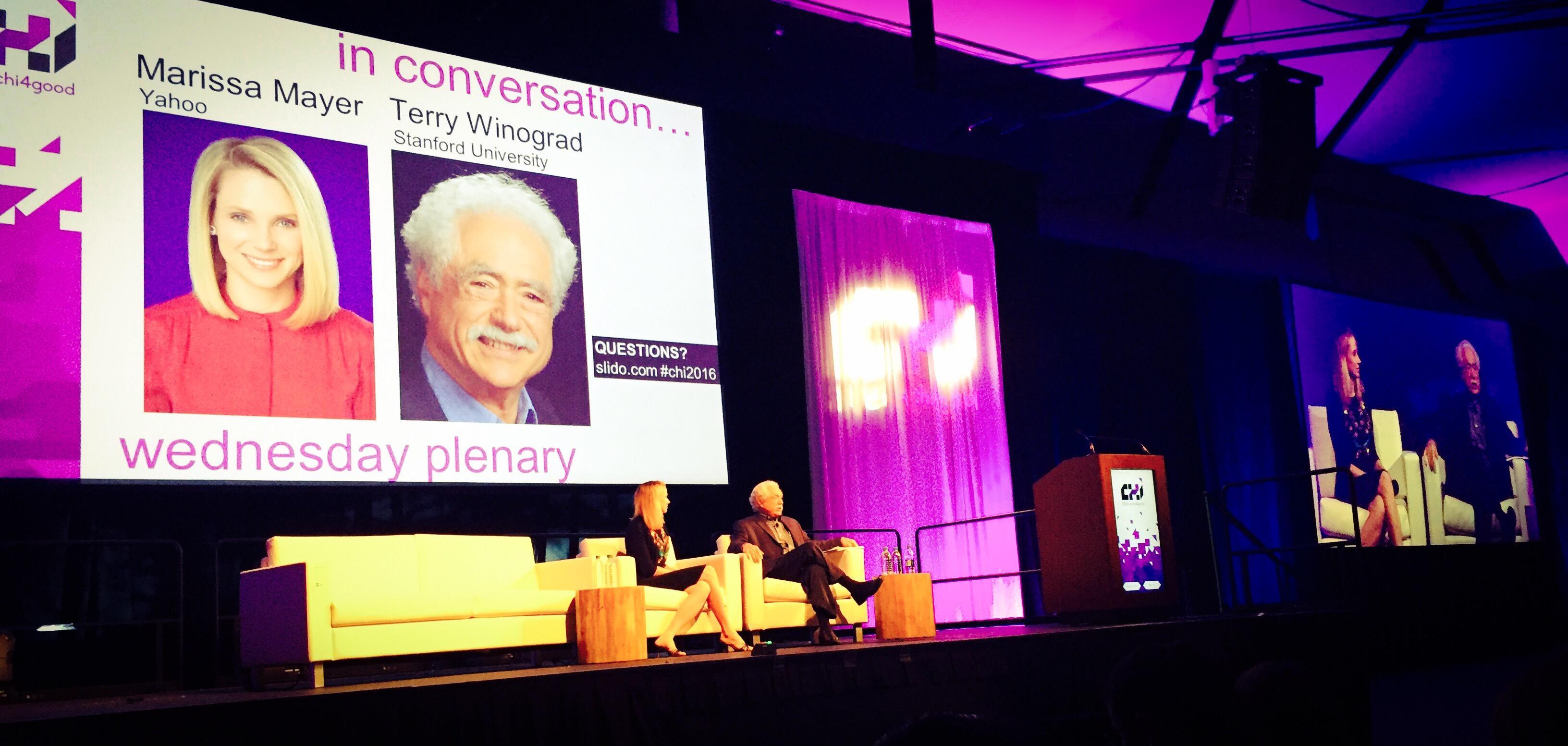 Marissa Mayer (Yahoo!) und Terry Winograd (ehem. Stanford University) eröffnete den 3. Tag der CHI 2016 mit einer Diskussion über gut gemeinte aber erzwungene Veränderung von Nutzerverhalten, die Gestaltung von Organisationen, die Balance zwischen Beweis und Intuition in der Produktgestaltung sowie Tipps für die Karriere.