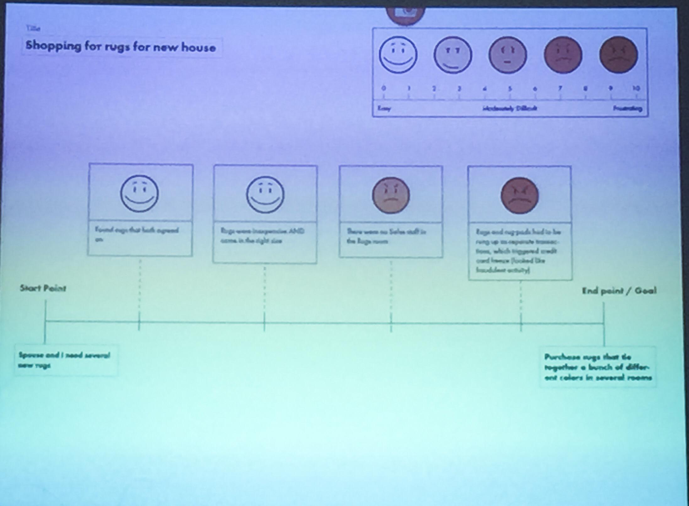 Dies wurde den Testpersonen als leeres Template am Ende eines einstündigen Interviews vorgelegt. Die Testpersonen füllten das Template aus und beschrieben so ihre Erlebnisse bei der Installation. Testpersonen und Interviewer gingen anschließend durch diesen Prozess und diskutierten die Erlebnisse. Die so entstandenen Geschichten wurden verglichen und im Unternehmen kommuniziert. Da die Geschichten sehr komprimiert und anschaulich waren, wurden sie im Unternehmen u.a. von der Marketing-Abteilung aufgegriffen.