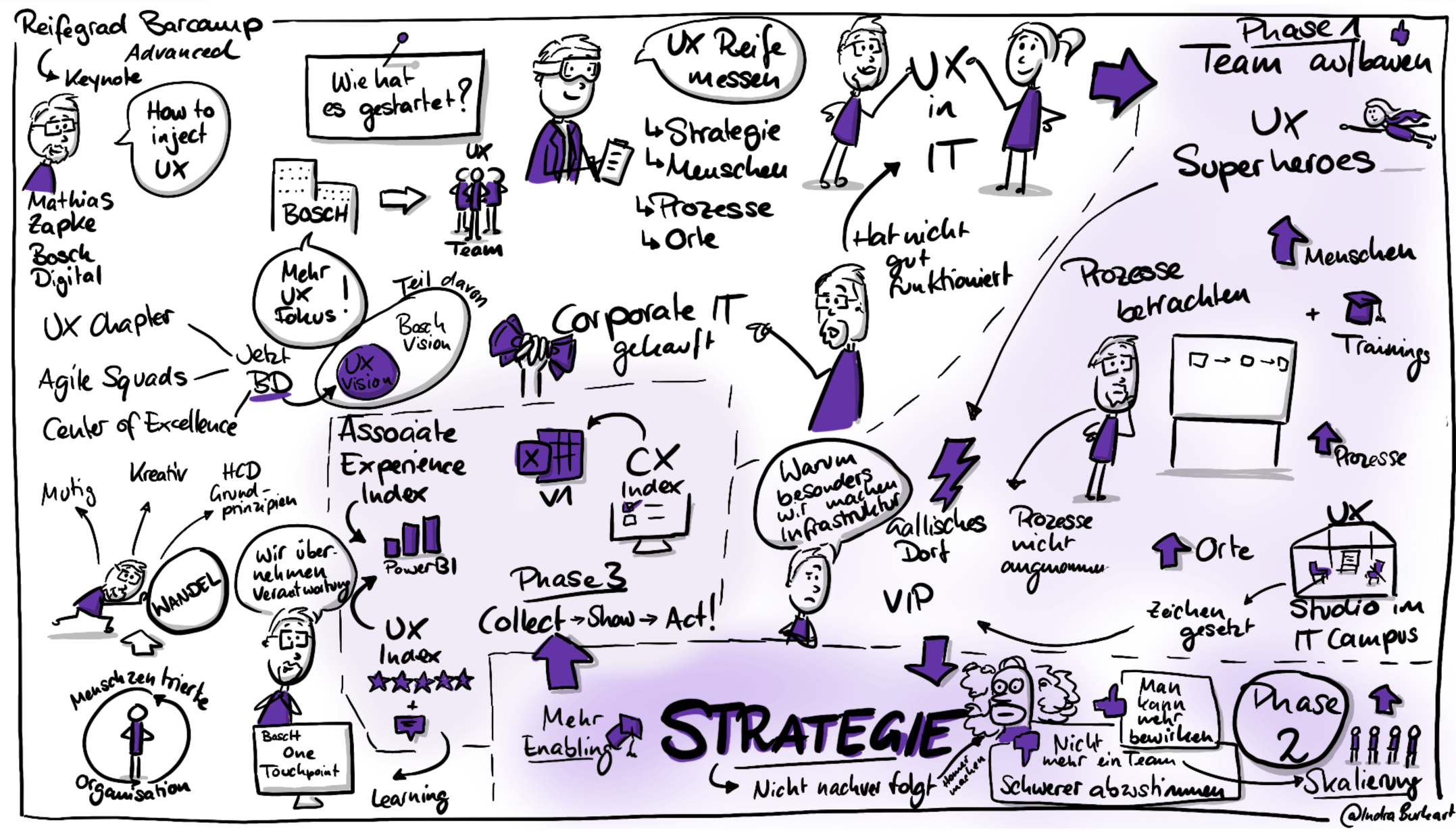 Nach einem Start im Interaktionsdesign bei IBM wechselte Mathias zu Bosch, um bei der Gründung einer zentralen UX-Abteilung dabei zu sein. Mathias erzählte vom Bosch UX-Model, einem angepassten UX-Maturity-Modell, das auf den Säulen Strategy, People, Processes (z.B. Co-Creation mit Kund:innen) und Places (z.B. Schaffung von Freiräumen für Kreativität und Research) beruht. Von dort wechselte Mathias in die Corporate IT, um Menschzentrierung auch dort zu etablieren.